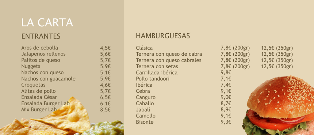 The Burger Lab es un restaurante de hamburguesas sabrosas. Nuestra intención es ofrecerte recetas sencillas, pero hechas con carnes exóticas de primera calidad y con un toque personal. Tradición pero también sorpresa. Reinterpretaciones de un clásico de la comida rápida. Todos nuestros ingredientes son elegidos cuidadosamente cada día y hasta el pan lo hacemos nosotros mismos. Nuestras hamburguesas son deliciosas porque están preparadas con esmero.